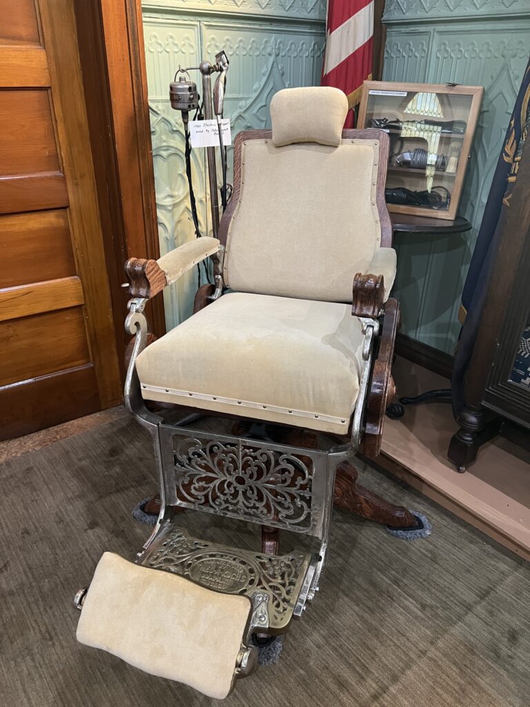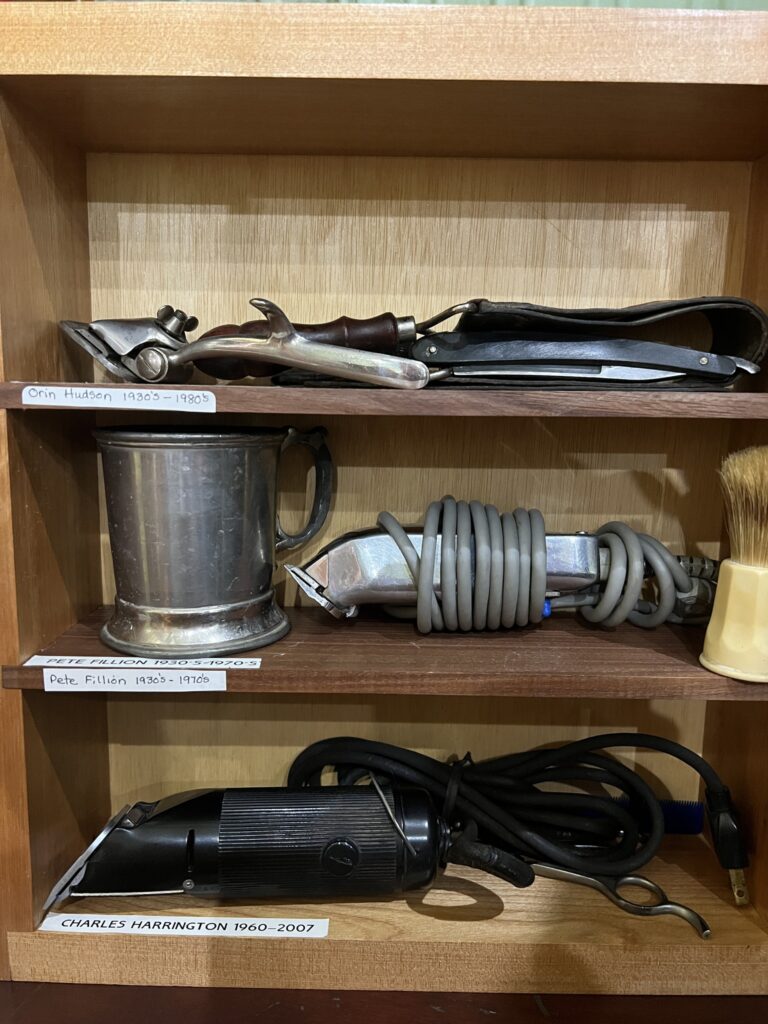 Upper Pemigewasset Historical Society Barber Collection, featuring a barber chair and barbering tools belonging to Oran Hudson, Pete Fillion, Charlie Harrington, and John Lynch.