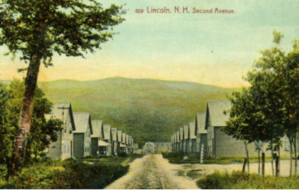 Postcard view of Second Avenue—also known historically as Sawdust Street and today’s Maple Street—in Lincoln, New Hampshire. The first house on the right, identifiable by the barber pole, was the home and barber shop of Oran and Mary Hudson. Before establishing this location, Oran Hudson operated his barber shop out of the Lincoln Hotel on Church Street, making this image a rare glimpse into the early commercial and residential life of downtown Lincoln in the early 20th century.