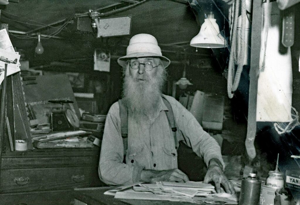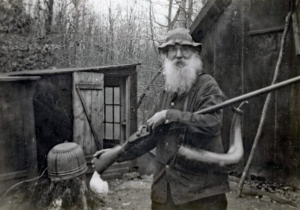 Shiff was, for a time, a District Ranger for the U.S. Forest Service. But he was not, by temperament, a bureaucrat. Those who visited him remembered a man intensely self-sufficient, even ritualistic. Surprisingly, he had a telephone, but it was for “outgoing calls only.” Guinea hens announced visitors before they reached the door; a Chow dog completed the alarm. Near the entrance stood a Winchester Model 1897 pump shotgun. A Smith & Wesson revolver rode in his pocket. A soft wool hat adorned his head; wool socks, his feet. Business was conducted one customer at a time.