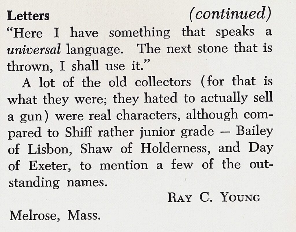 He was a dealer, collector, and correspondent, operating largely by mail. His mimeographed catalogs and letters circulated widely, advertising Winchesters, Sharps rifles, flintlocks, revolvers, ammunition, and obscure accessories that many collectors had never seen. He advertised in early collector publications such as Hobbies, and his reputation for “square dealing” was widely acknowledged.
